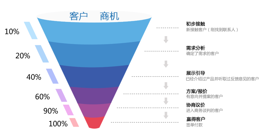 客户管理系统则是企业把控销售过程的好工具。系统可以让企业可以深入了解到销售过程的每一个细节,打通从销售线索到客户、从客户到商机、从商机到合同、从订单到回款的整体流程;同时,管理者能够通过系统实时掌握团队动态,借助多维度的销售漏斗分析,做出精准销售预测,随时掌握销售全局。