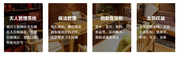 而共享空间,共享茶室的实现则需要通过互联网、物联网等技术,包间门锁、电灯、空调、饮水机等都是系统控制的,顾客开门消费的时候就能自动通电,顾客消费结束就会自动断电,顾客就可以自行离开,包间打扫结束后,又可以继续迎接下一波客人。这样的营业方式让老板可以远程营业,并且24小时开店。